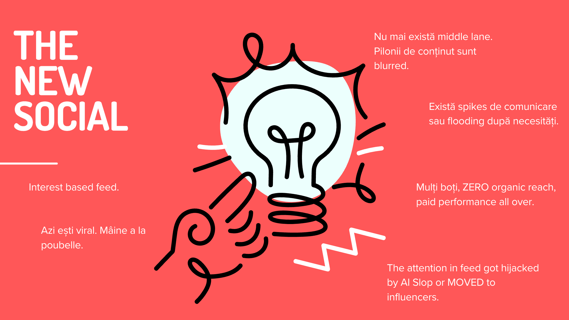 Social media de azi și cel din viitorul apropiat nu mai conține un middle lane pentru brand comms. Înainte aveai un spațiu la mijloc, între obscuritate și viralitate unde puteai menține o conversație. Not the case anymore.