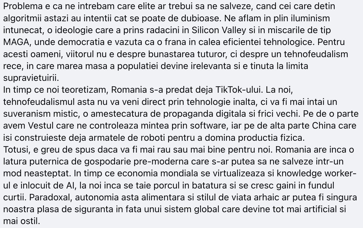 Basically, suntem extrem de nepregătiți de ceea ce se întâmplă în lume la ora asta și discursul cu bază în inovație tehnologică. Adică putem discuta despre acceleraționism, dar cu siguranță nu pe meleagurile noastre.