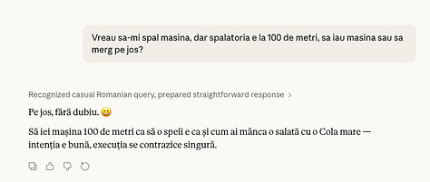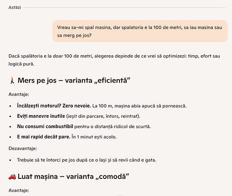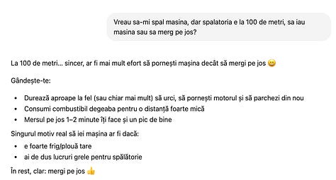 Am întrebat CoPilot, Chat GPT, Gemini și Claude aceeași întrebare. Dintre toți, doar Gemini și-a dat seama de schemă și mi-a zis că dacă vreau să spăl mașina, normal că iau mașina, DAR dacă vreau să fac o programare, să mă duc pe jos. Lol.