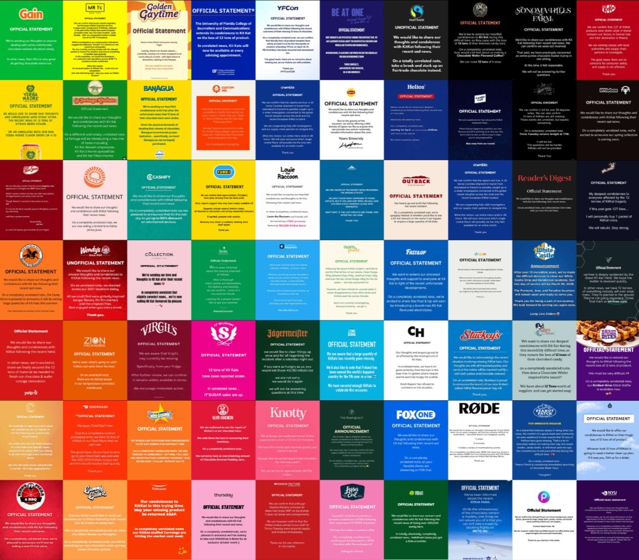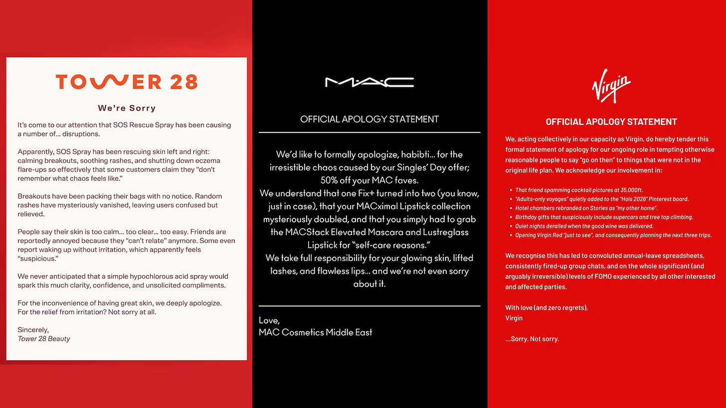 Volkswagen Mumbai și-a cerut scuze că mașinile lor sunt atât de plăcute de condus încât proprietarii le împrumută familiei mai mult decât ar trebui. Moonbrew, un brand de gume cu melatonină, posta scrisori de scuze pentru că produsul e prea eficient. Uresta, un brand de produse pentru incontinență urinară, a menționat femei care fac „clutching their pearls”. Adică scuze că produsul funcționează.