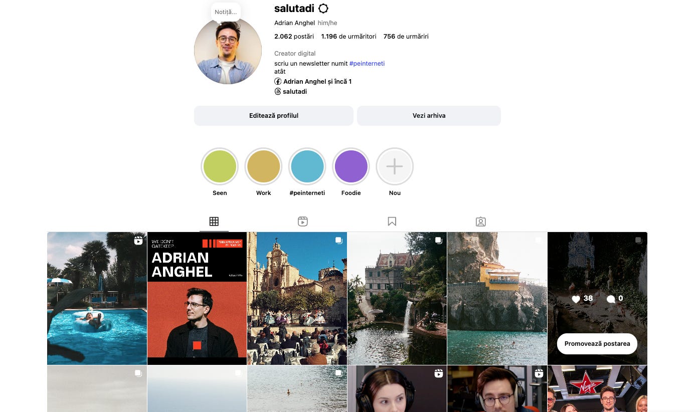 Mi-a apărut formula asta de afișare a profilelor de vreo două săptămâni încoace și se pare că am fost inclus într-un test al celor de la IG privind noul design de desktop. O concluzie tragem de aici: gridul nu mai contează deloc. Știm, era o vreme când atât brandurile, cât și utilizatorii de rând trăgeau tare să aibă un grid frumos, estetic. Not the case, anymore.