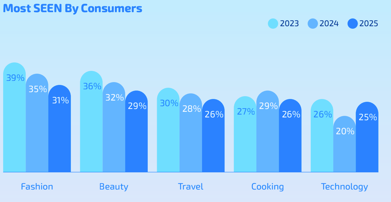 Spre deosebire de 2023, procentele de most seen by consumers din parteneriatele cu influencers a început să scadă. De la 39% la 31% în fashion, 36% la 29% în beauty, travel și el cu vreo 4 procente, iar cooking & tech sunt pe acolo, în range. Ce înțelegem de aici? It might be lower budgets, less partnerships sau relevanța parteneriatelor sau a influencerilor în sine a scăzut.